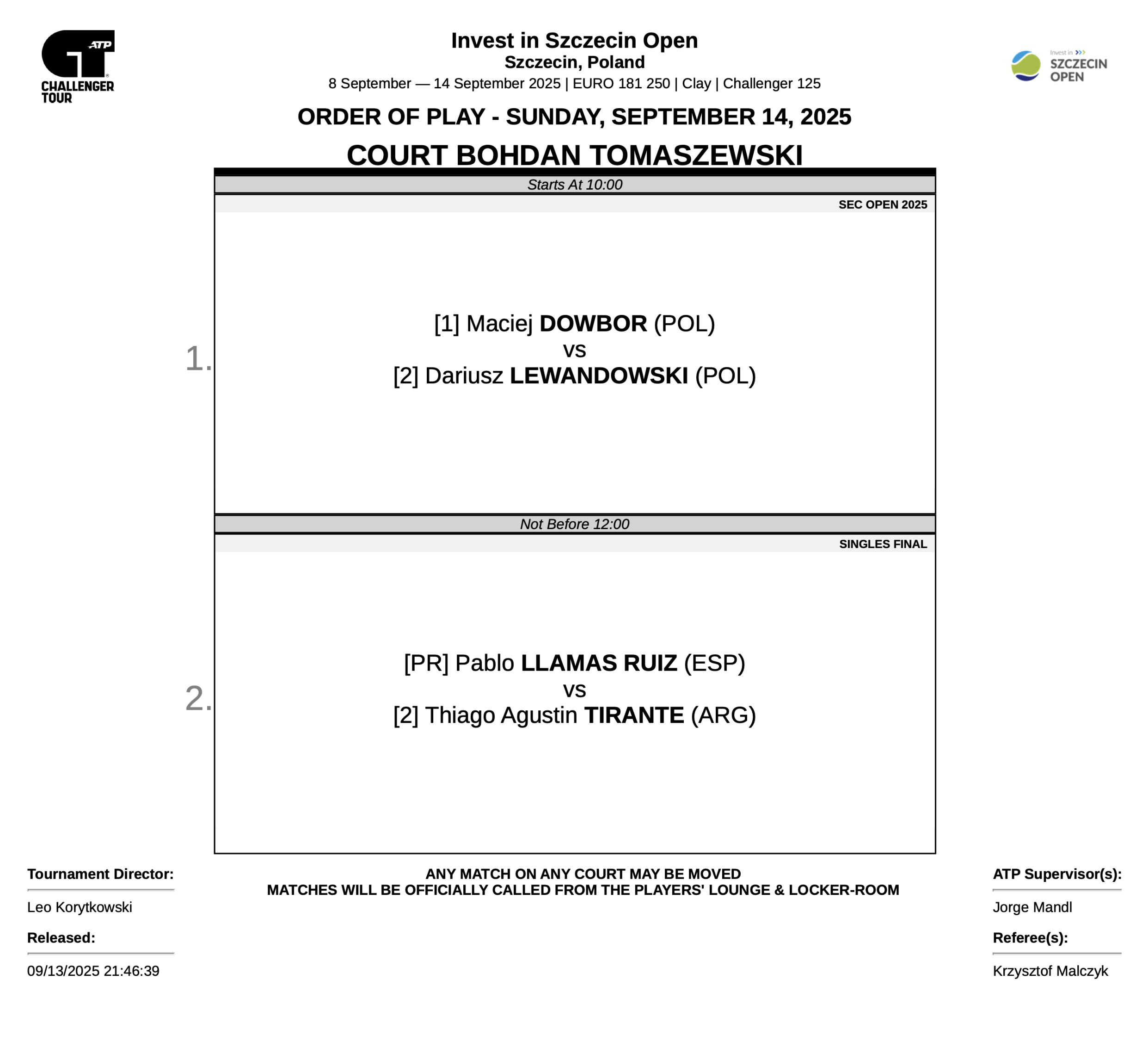 W niedzielę o godzinie 10:00 rozpocznie się finał SEC Open Tenisowego Turnieju Artystów, w którym zagrają Maciej Dowbor i Dariusz Lewandowski. Natomiast w samo południe o tytuł w grze pojedynczej rywalizować będą Pablo Llamas Ruiz i Thiago Tirante.